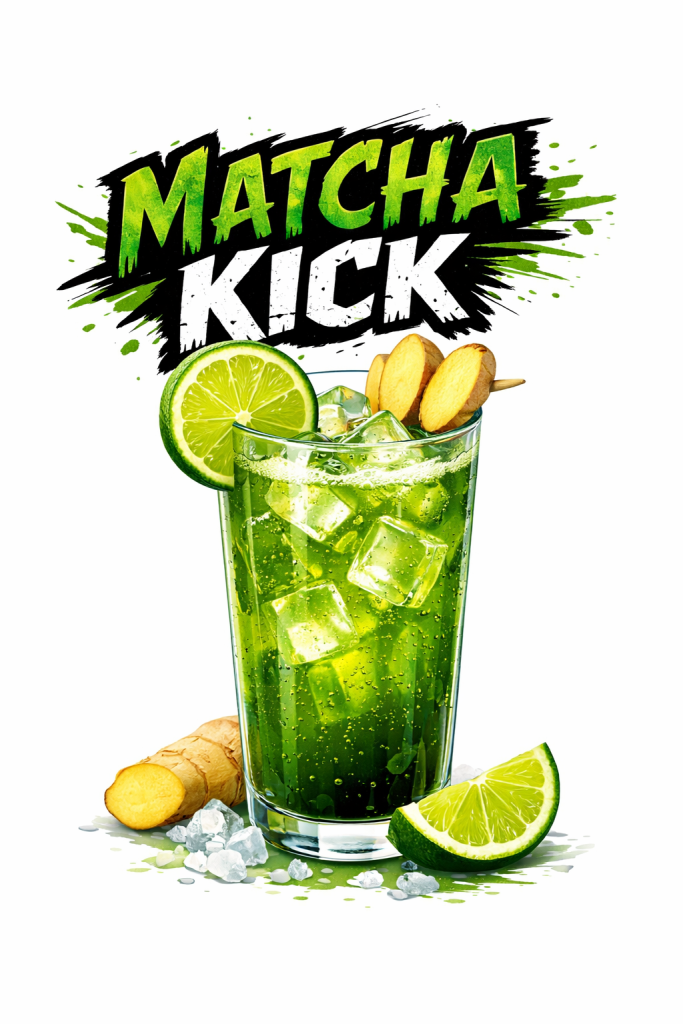- 4 cl gin (ou vodka si tu veux plus neutre) 2 cl sirop matcha noir – gingembre – 2 cl jus de citron vert – 1 cl Cointreau ou triple sec – eau gazeuse – glace